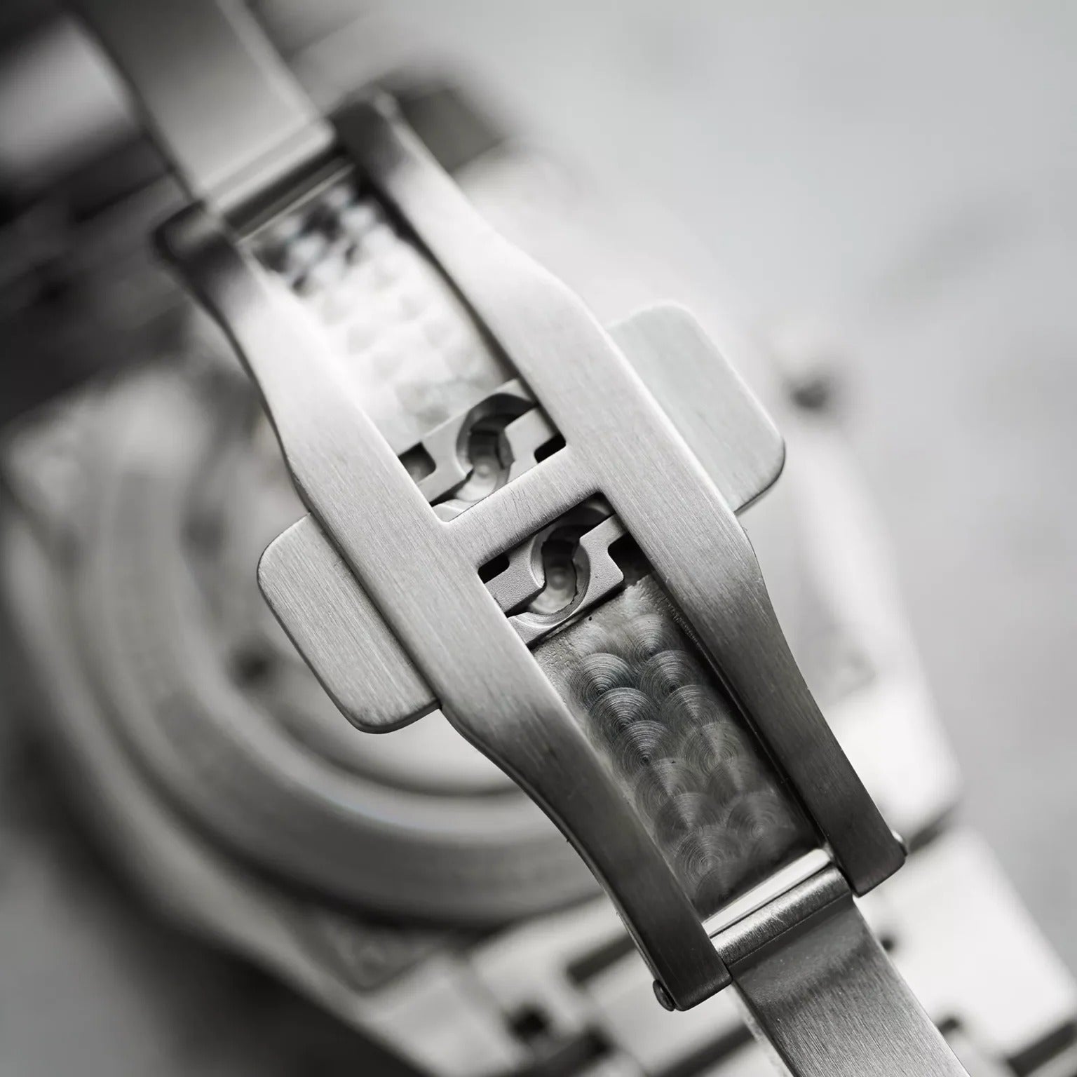 - Massives, integriertes Stahlband mit Schnellwechselsystem, verschraubten Gliedern (inkl. zwei Halbgliedern und Schraubenzieher) und Schmetterlingsschließe