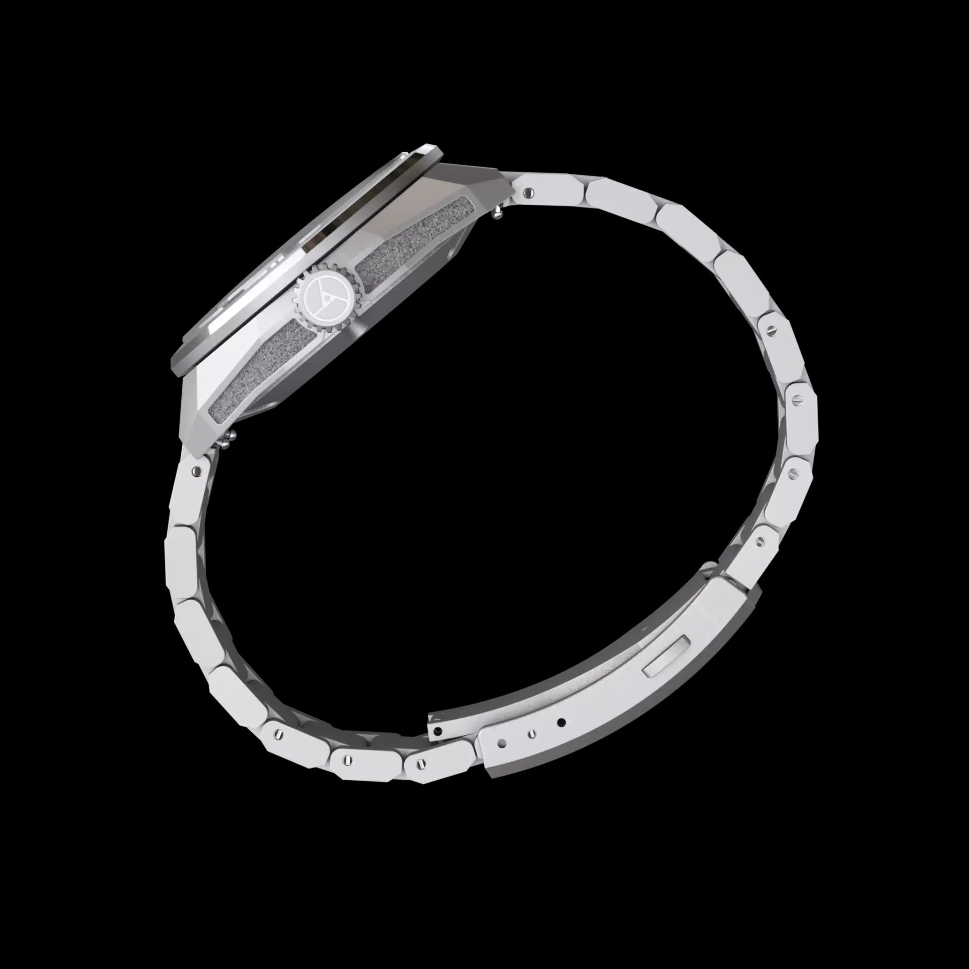 Die Lünette mit ihren zwei sich überlappenden konischen Flächen und ihrem zum Gehäuse hin abfallenden Rand erzeugt einen außergewöhnlichen dreidimensionalen Effekt. Die harmonischen Linien des Gehäuses setzen sich bis zum integrierten Edelstahlarmband fort. Komplexe geometrische Formen fangen das Licht ein und reflektieren es auf vielfältige Weise, je nach Blickwinkel immer wieder neu und faszinierend.