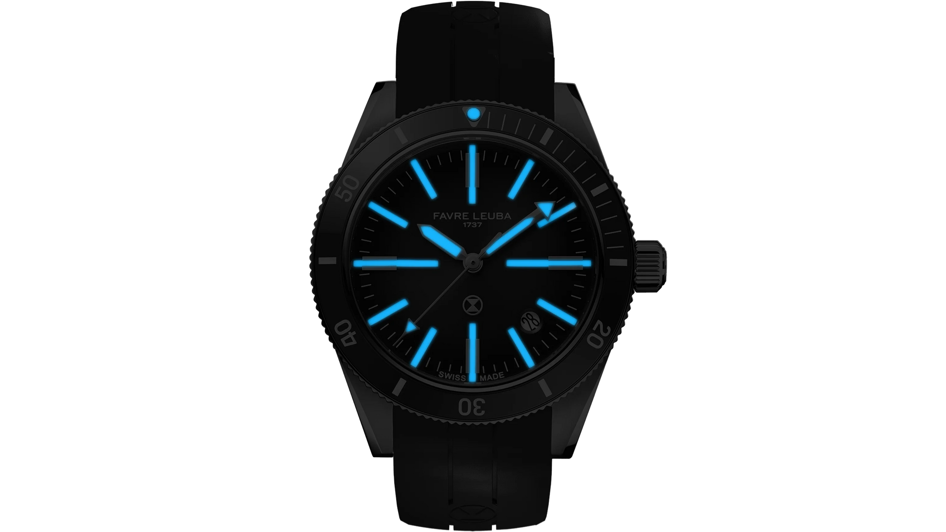 Das Zifferblatt ist als zweischichtige Sandwich-Konstruktion ausgeführt. Die obere Ebene mit perforierten Indizes gibt den Blick auf die darunterliegende, mit Super-LumiNova beschichtete Ebene frei. Groß dimensionierte Indizes und markante, ebenfalls mit Leuchtmasse belegte Zeiger gewährleisten eine gute Ablesbarkeit auch bei schwachen Lichtverhältnissen.