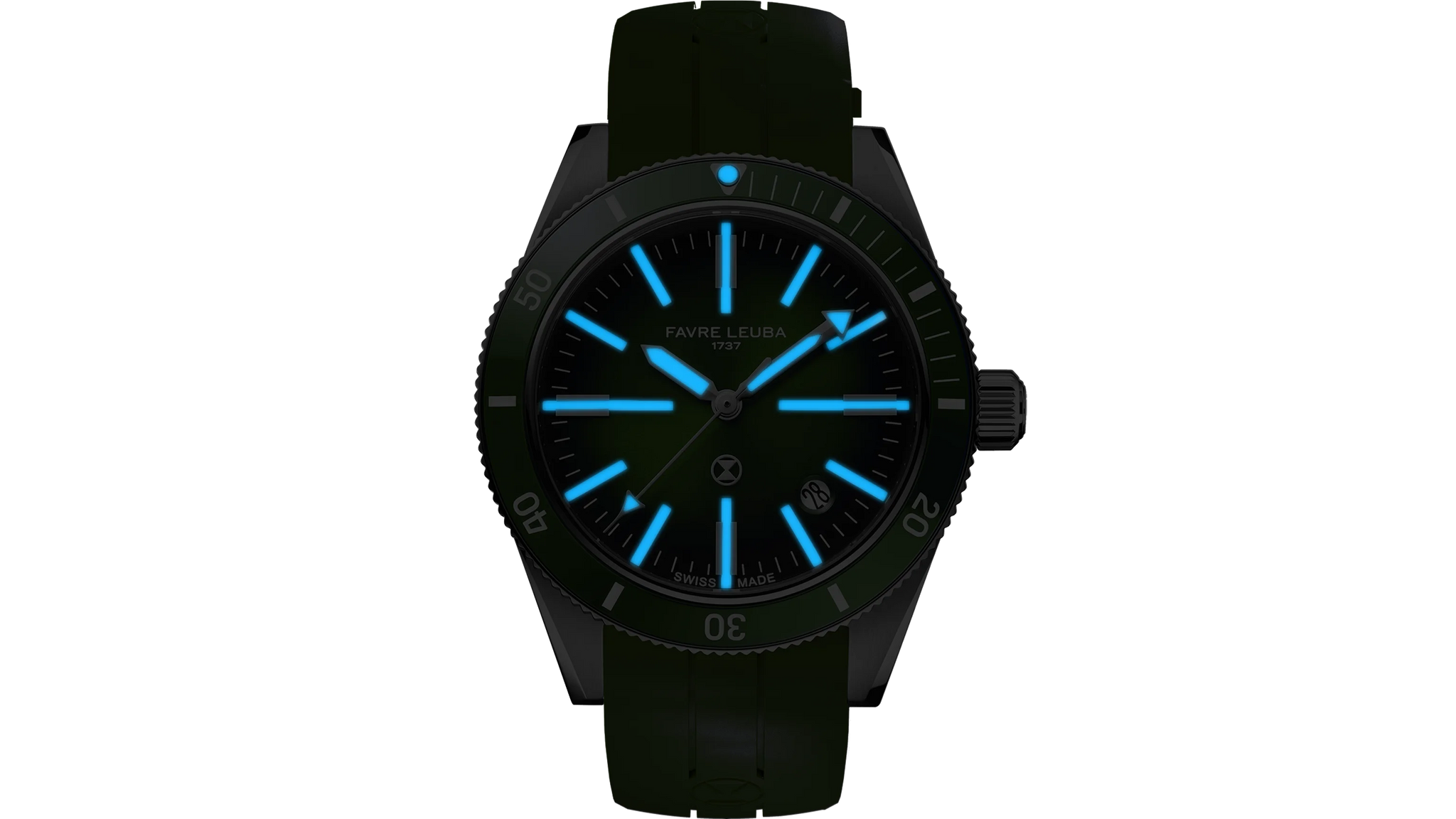 Das Zifferblatt ist als zweischichtige Sandwich-Konstruktion ausgeführt. Die obere Ebene mit perforierten Indizes gibt den Blick auf die darunterliegende, mit Super-LumiNova beschichtete Ebene frei. Groß dimensionierte Indizes und markante, ebenfalls mit Leuchtmasse belegte Zeiger gewährleisten eine gute Ablesbarkeit auch bei schwachen Lichtverhältnissen.