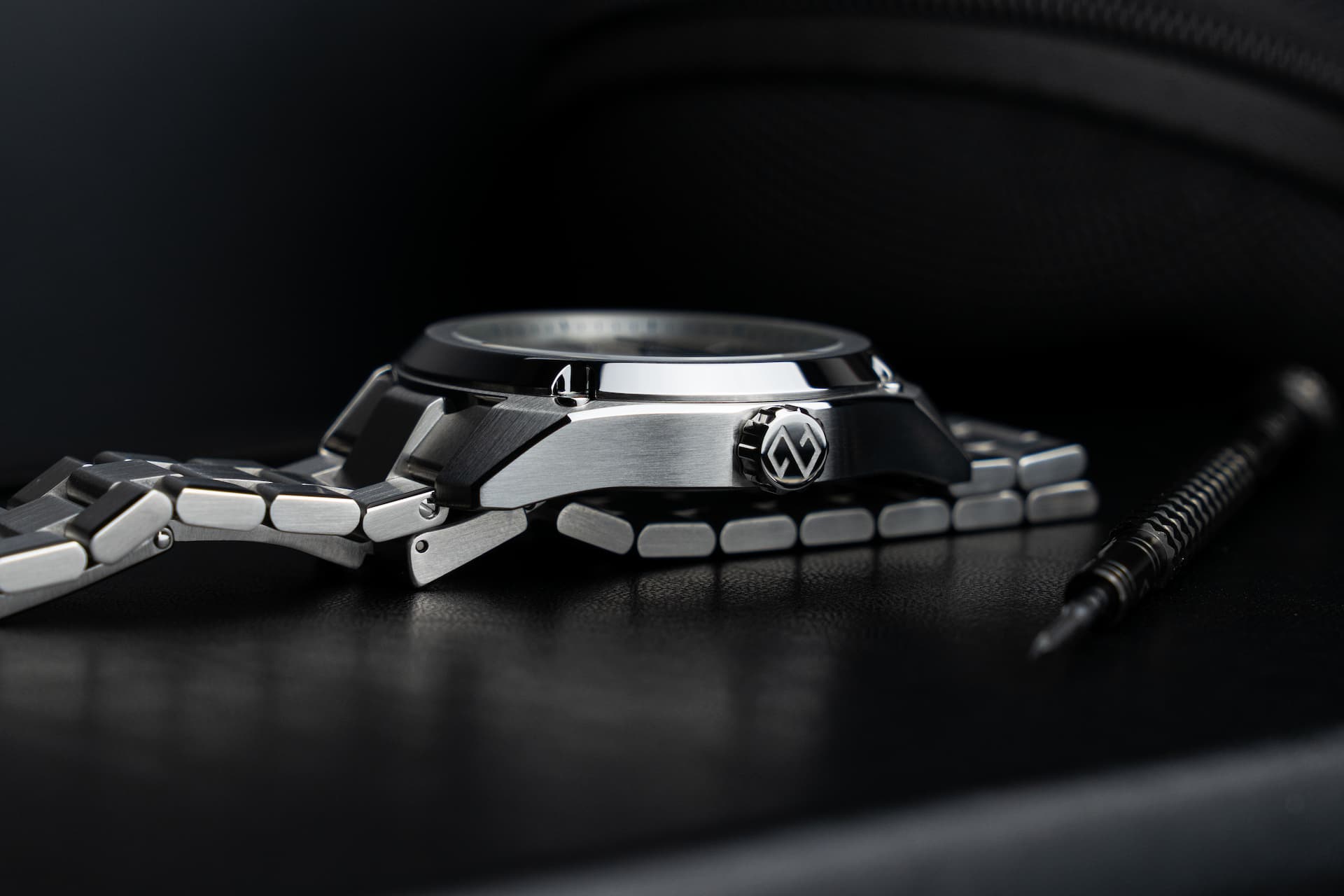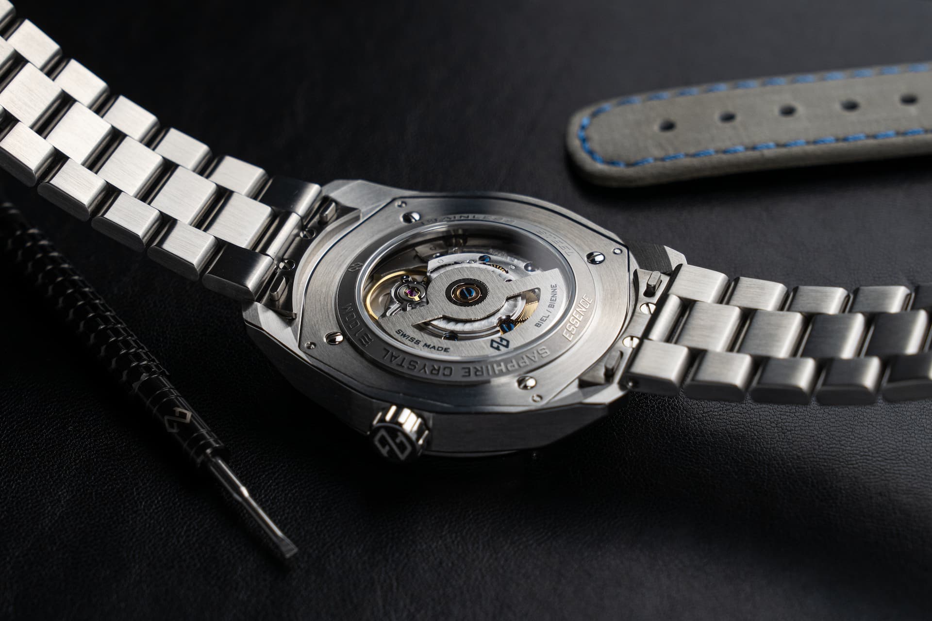 - Italienisches Lederband mit gebogenen Federstegen, Schnellwechselsystem und Edelstahl-Karbon-Faltschließe mit patentierter Feinjustierung