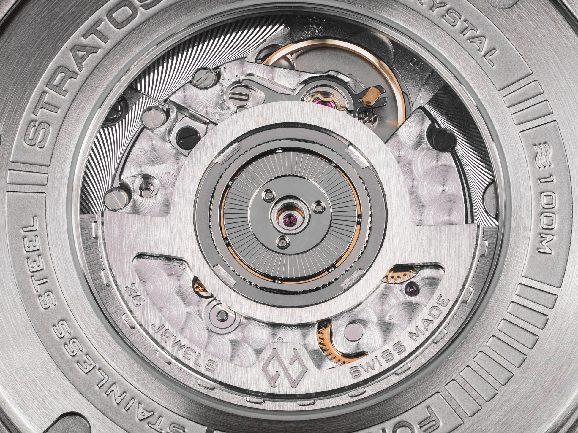 - Automatikwerk (mechanischer Selbstaufzug), hergestellt in der Schweiz
