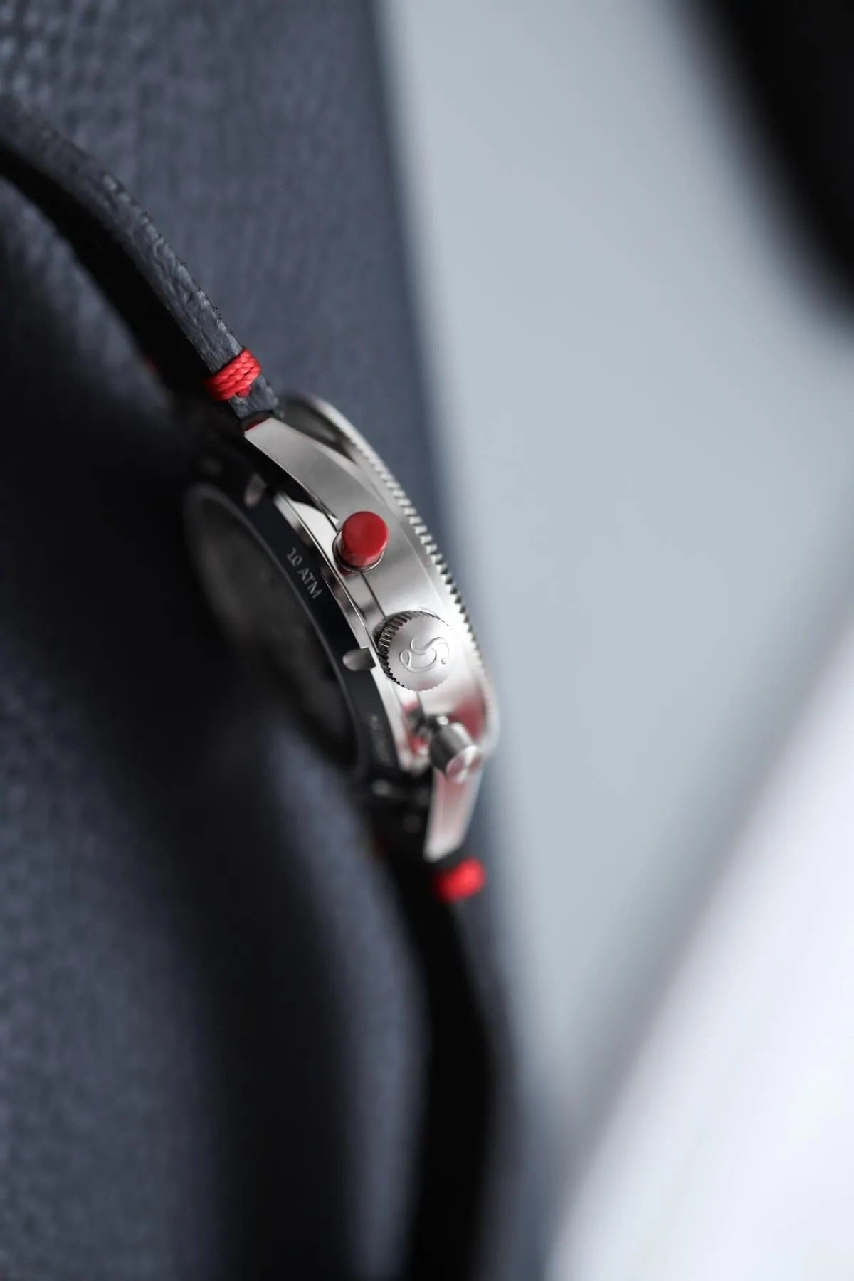 - Kannelierte Lünette, beidseitig, stufenlos drehbar mit roter Markierung