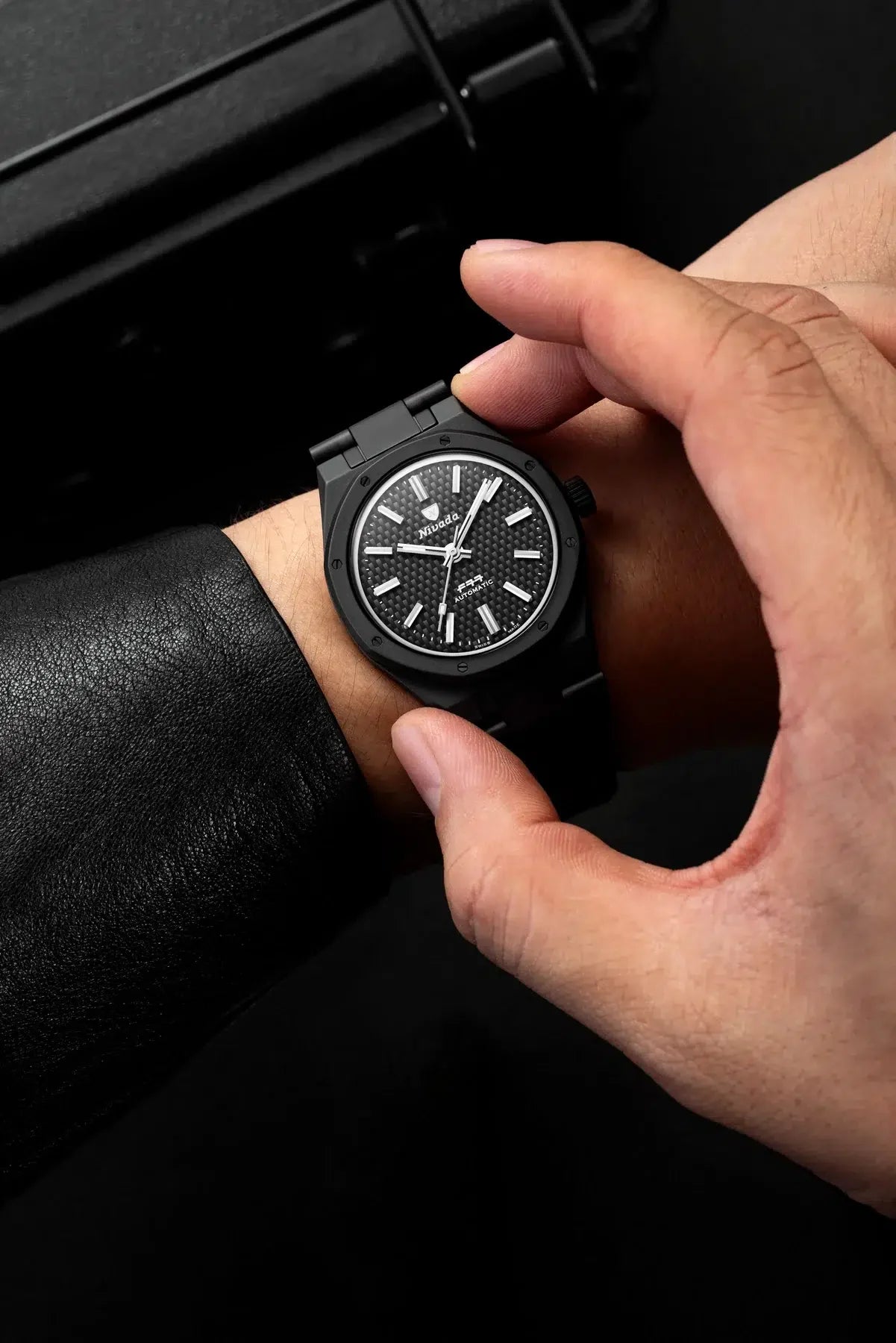 • Schwarzes Zifferblatt mit Carbonstruktur