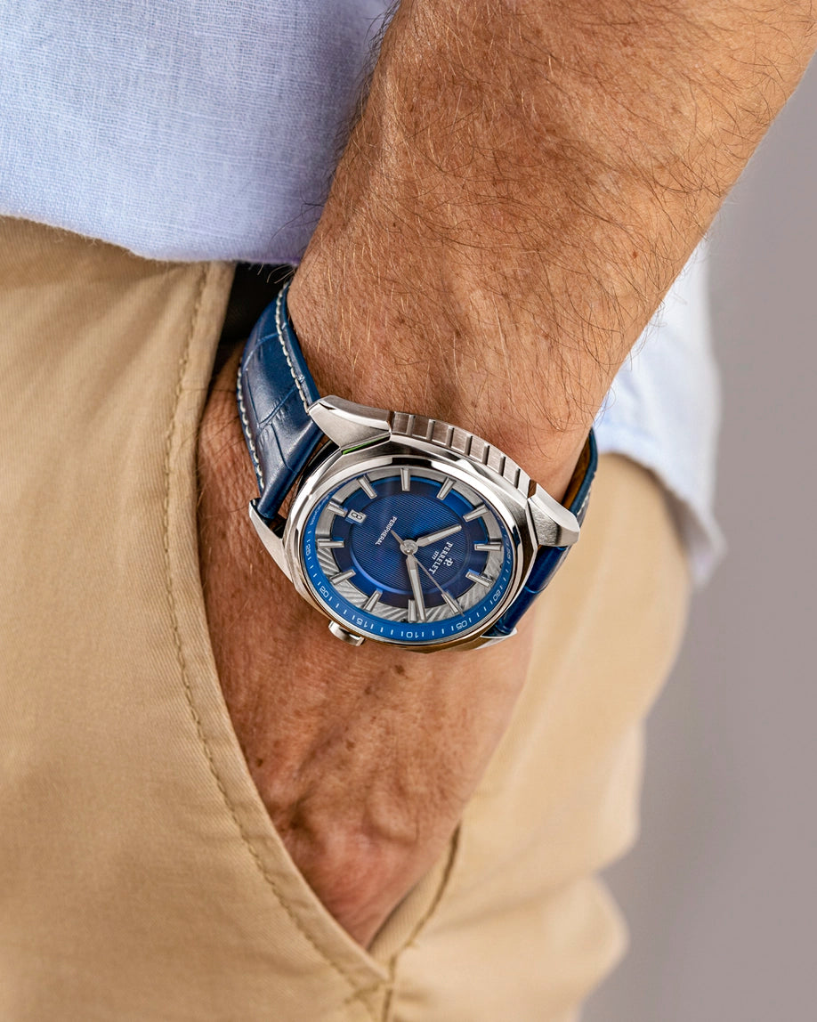 Das 42 mm Edelstahlgehäuse mit Saphirglas sorgt für Präsenz und Robustheit. Im Inneren arbeitet das Automatik-Kaliber P-411 mit ca. 42 Stunden Gangreserve und Datumsanzeige.