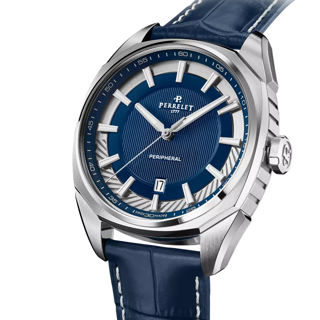 Die Perrelet Lab Peripheral A1100 ist eine Schweizer Luxus-Automatikuhr für Herren, die technische Innovation sichtbar macht. Herzstück ist der außergewöhnliche Peripherrotor, der am äußeren Rand des Uhrwerks läuft und dem Design eine moderne, architektonische Tiefe verleiht.