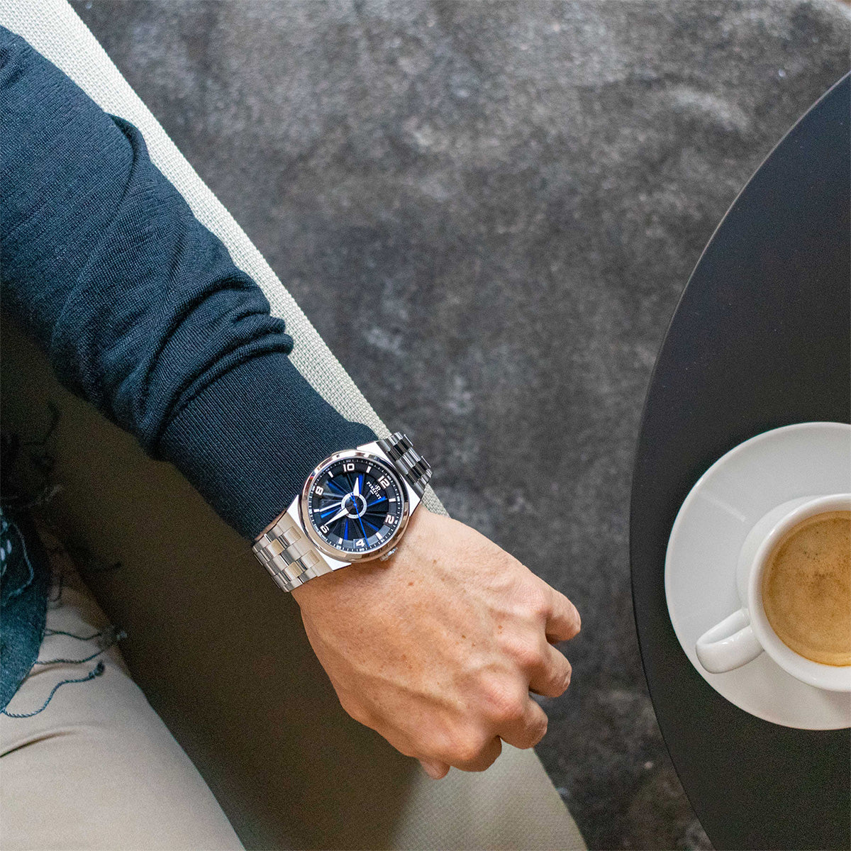 - Blaues Zifferblatt sichtbar durch die Turbine durch Handgelenksbewegung