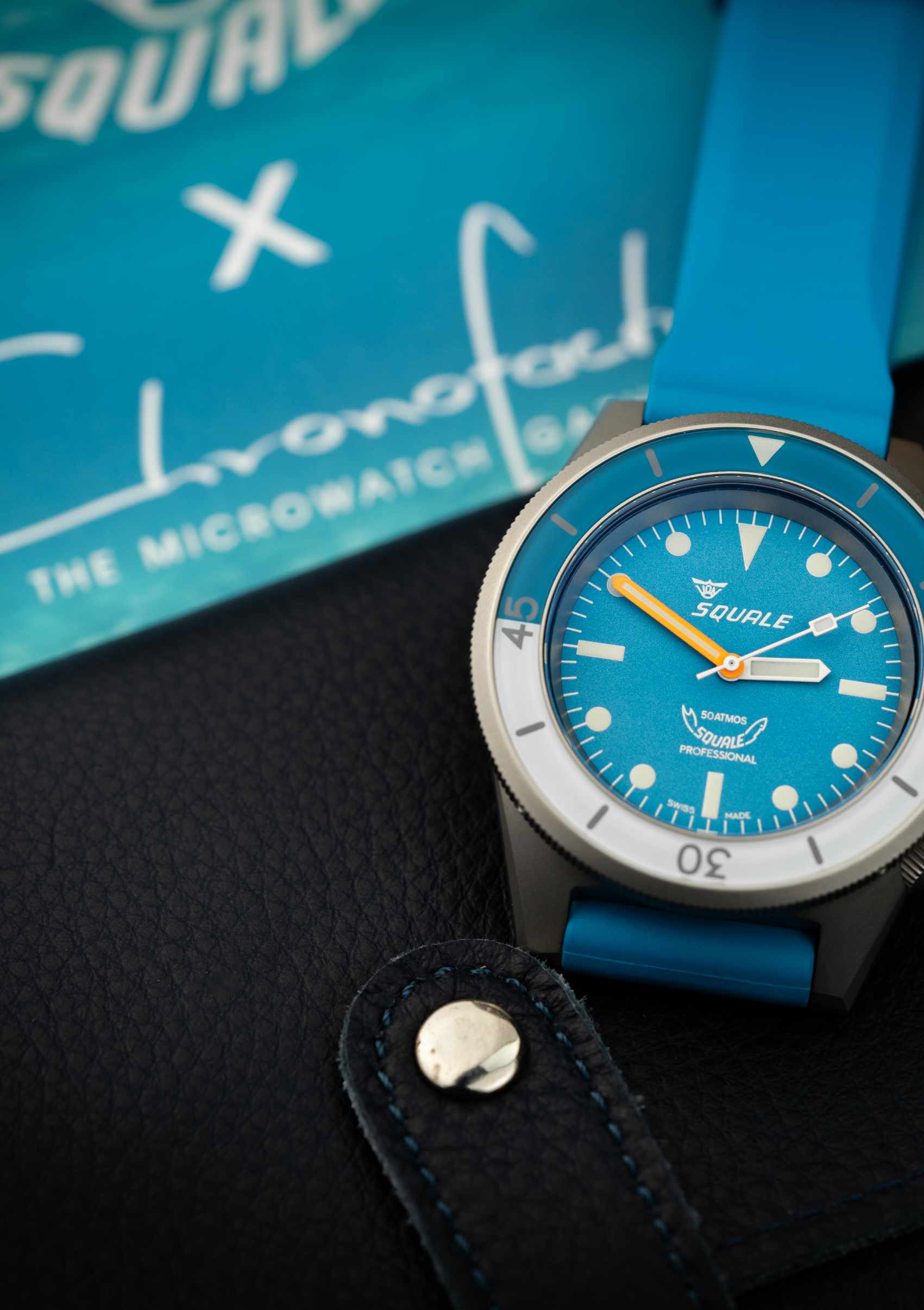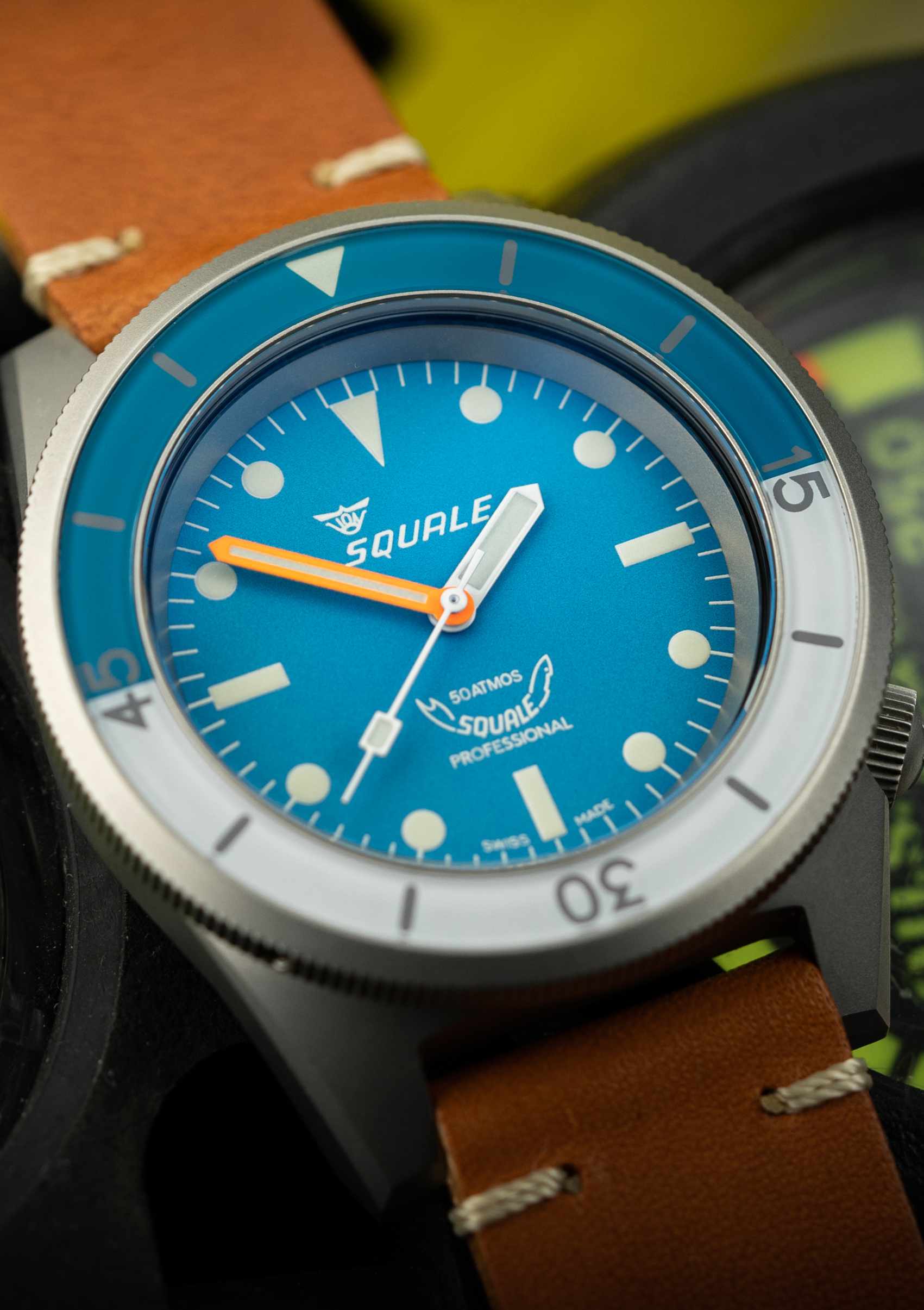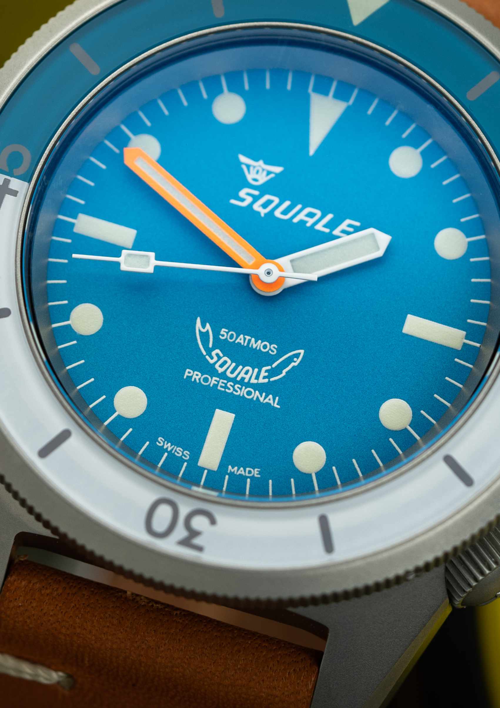 - Zifferblatt in hellem Blau, dem Farbton der Squale Matic XSE nachempfunden, mit mattem Finishing