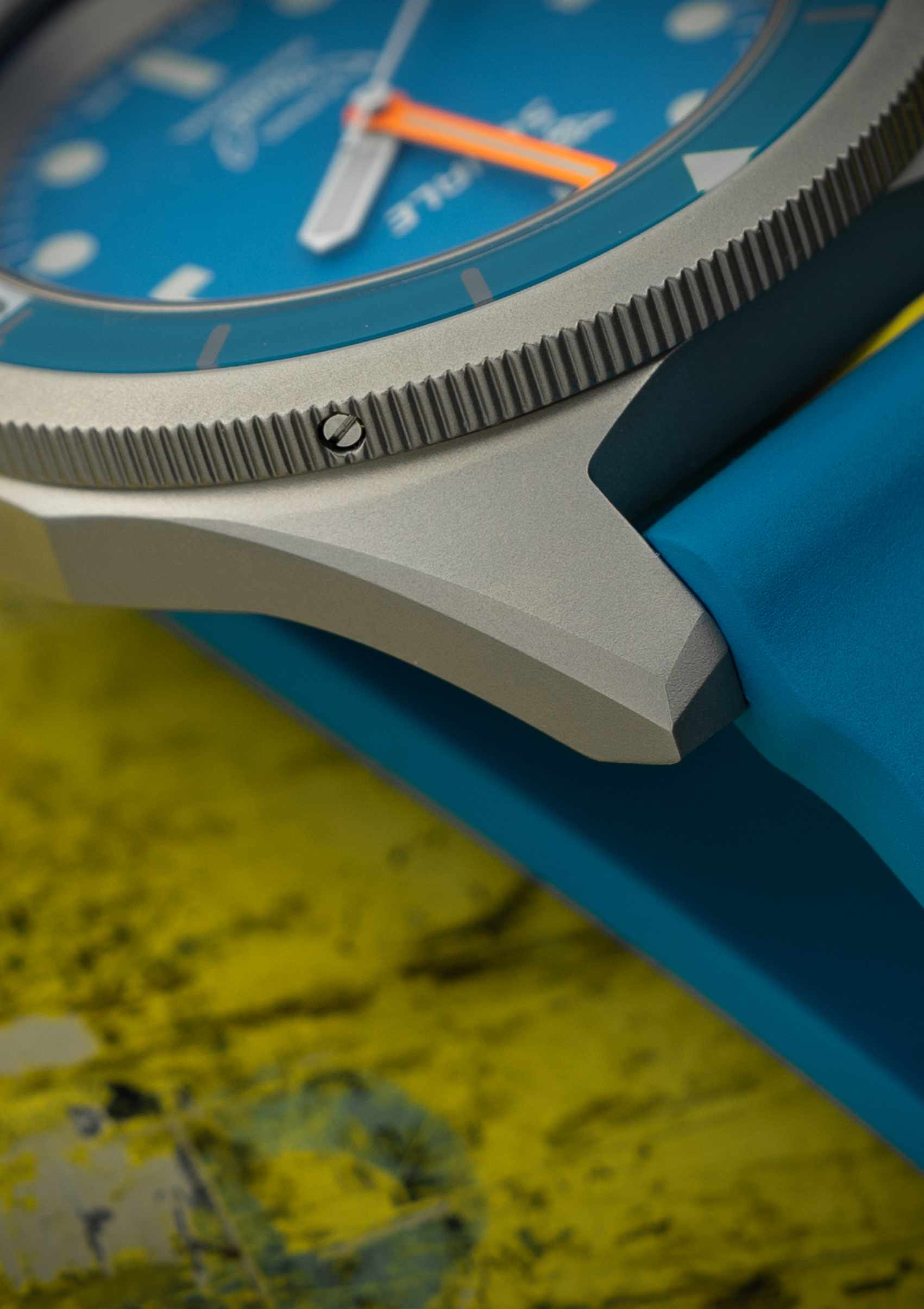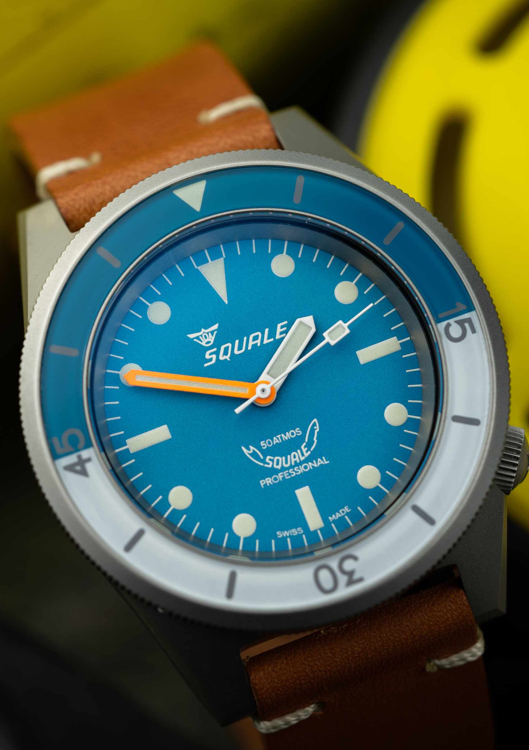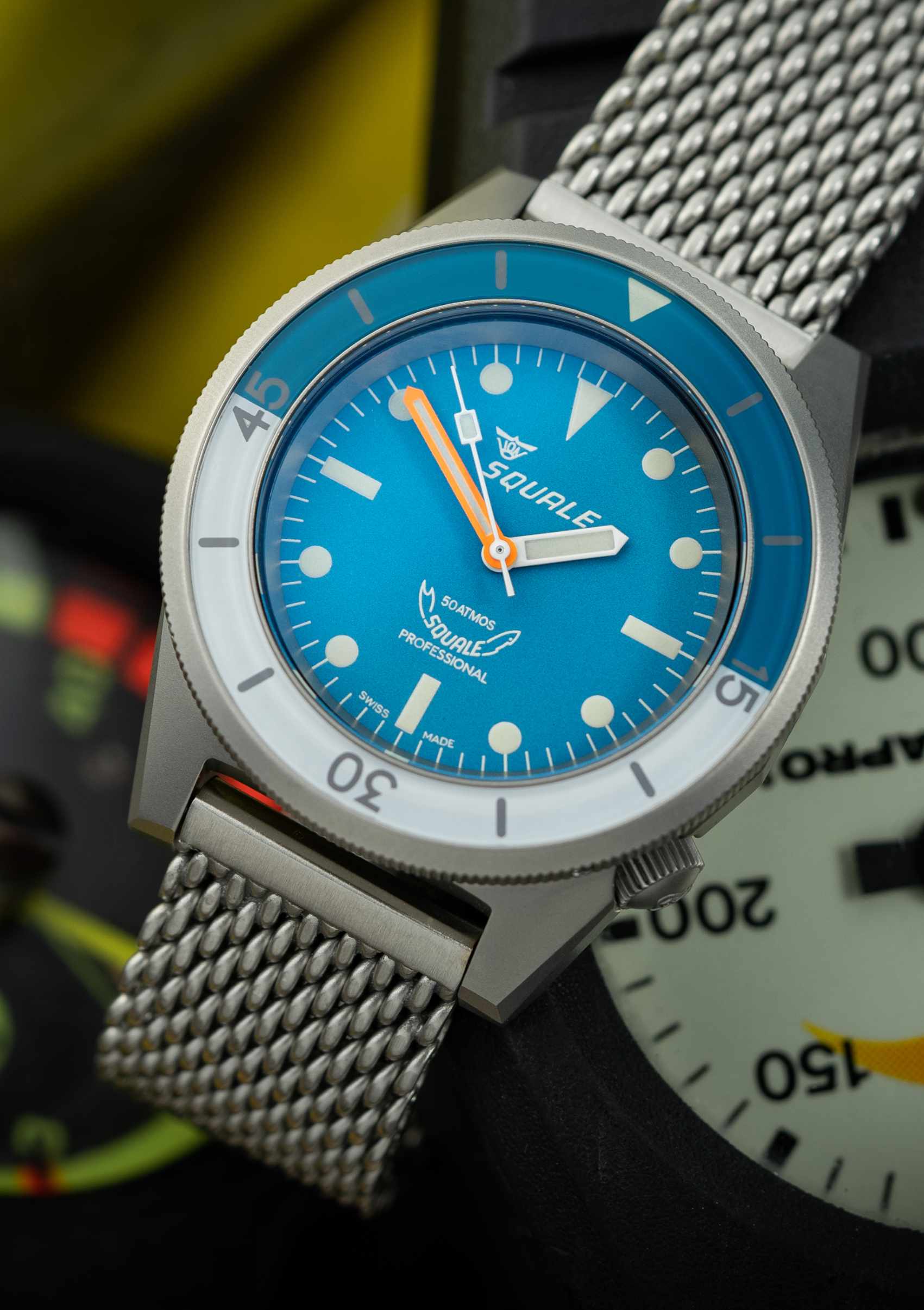 - Zifferblatt in hellem Blau, dem Farbton der Squale Matic XSE nachempfunden, mit mattem Finishing