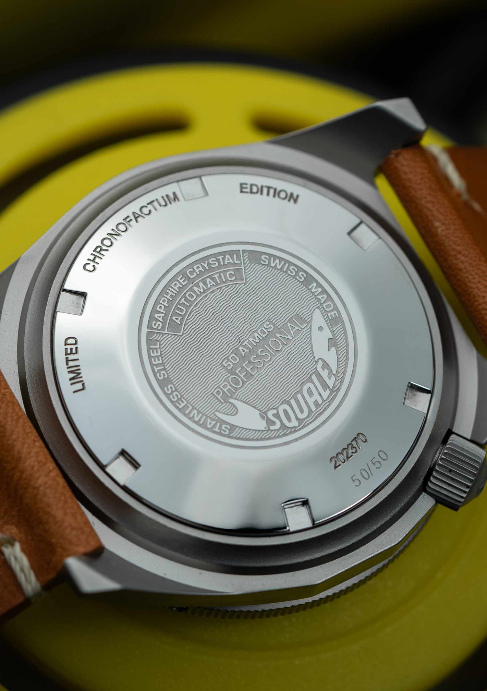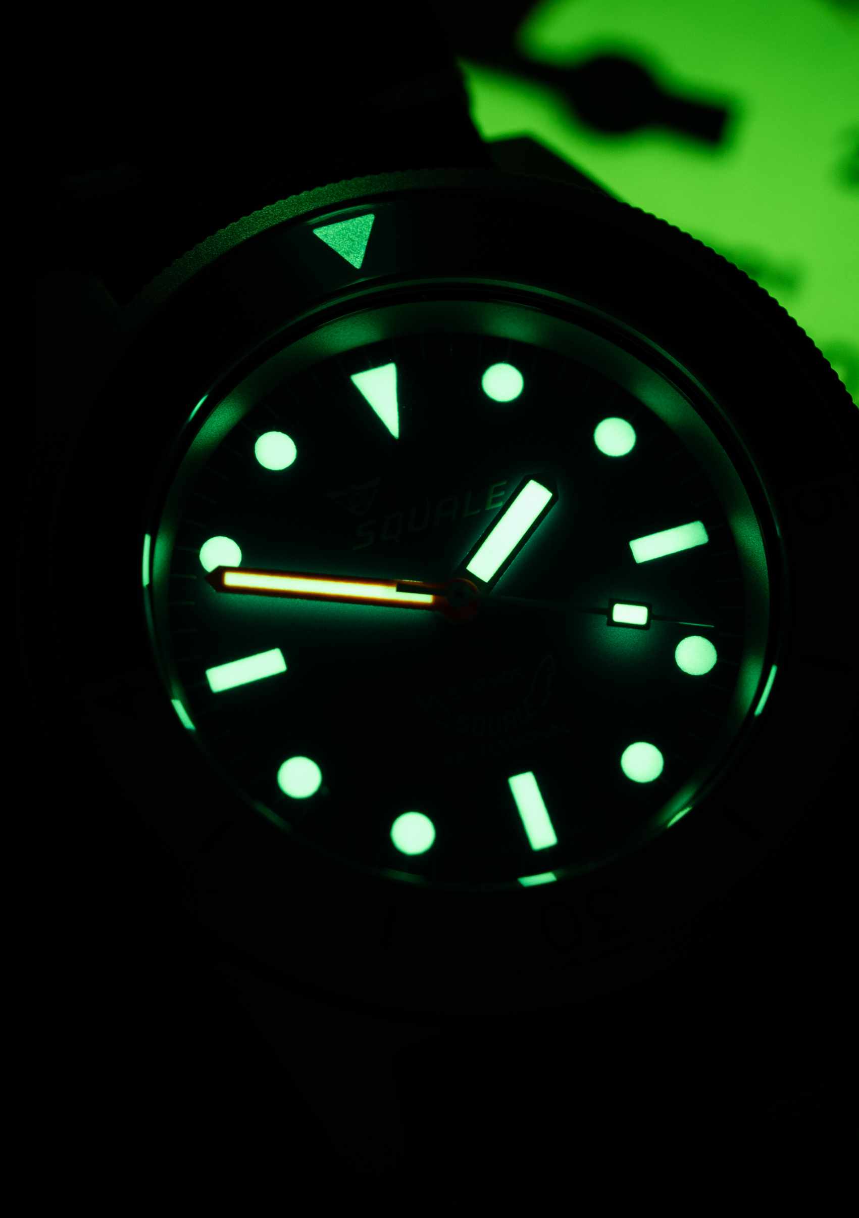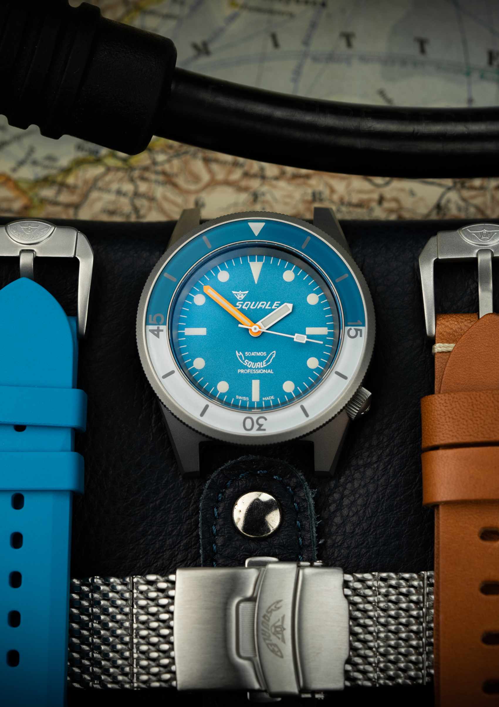 - Farblich auf das Zifferblatt abgestimmtes Bonetto Cinturini Kautschukband mit sandgestrahlter Squale Dornschließe