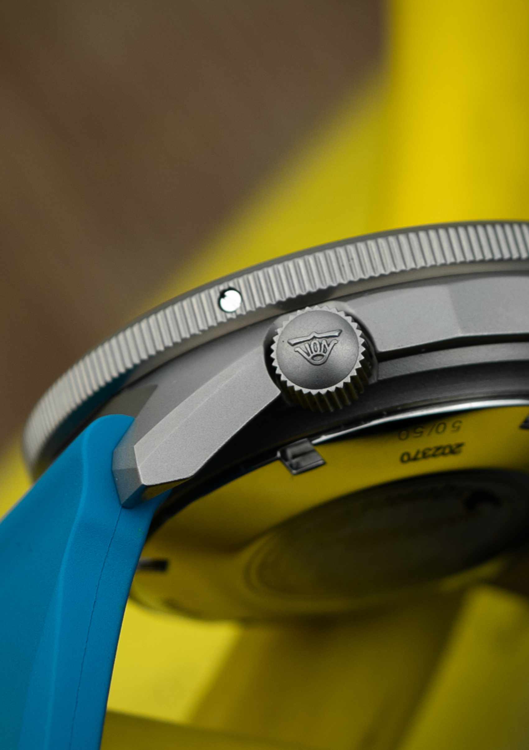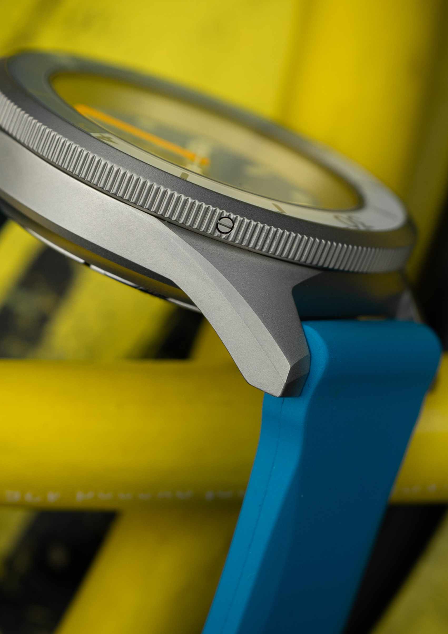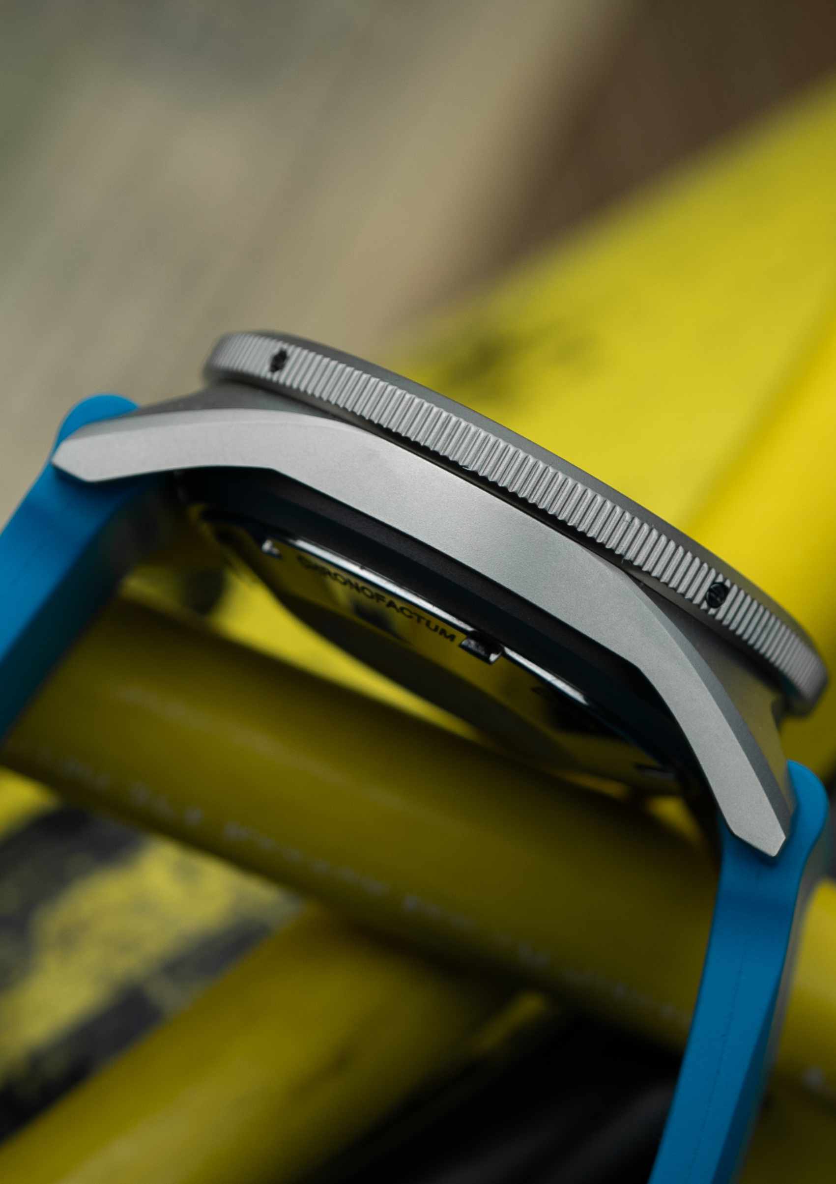 - Farblich auf das Zifferblatt abgestimmtes Bonetto Cinturini Kautschukband mit sandgestrahlter Squale Dornschließe